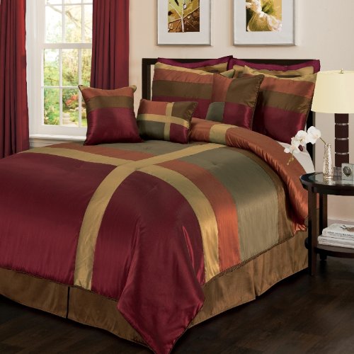 - 8-Piece set includes: Comforter 90-inch by 92-inch, bed skirt 60-inch by 80-inch with 14-1/2-inch drop, 2 pillow shams 26-inch by 20-inch, 2 euro shams 26-inch by 26-inch, oblong pillow 12-inch by 18-inch, square pillow 16-inch by 16-inch